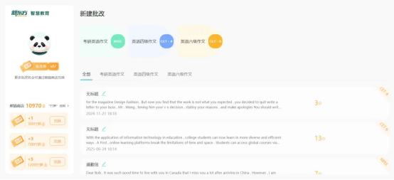 AI智能批改:依托新东方自有 AI 模型与一线教师经验,研发并上线英文作文批改服务,提供详尽评分报告,帮助学生精准定位问题。